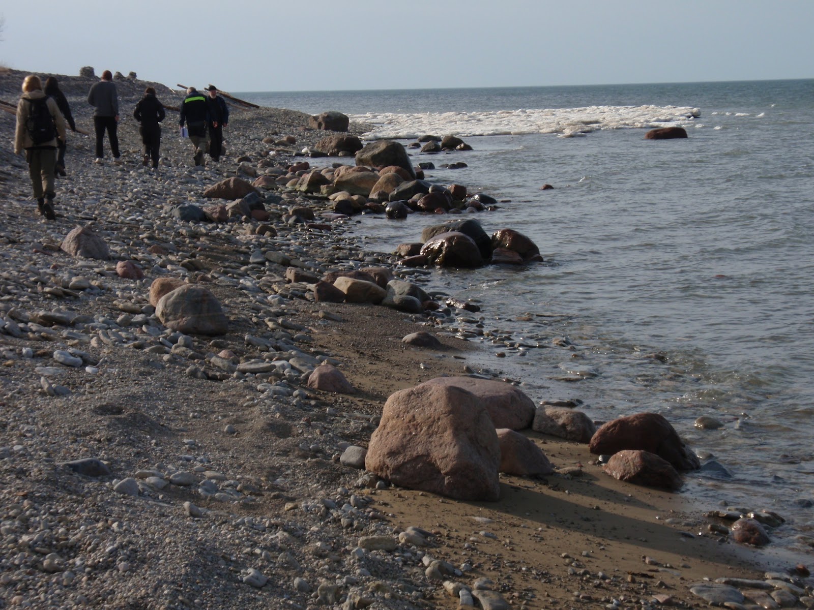 The snow that had once lain over a part of the shore had been ripped up by the waves, broken into large, angular blocks, so reminiscent of actual rock blocks that I could not help taking a picture. Among the actual rocks, there were many with small, round, smooth holes, quite similar to spongy textures. Our teacher mentioned that these had been carved out by slightly acidic water. These were, however, recent features, and did not tell anything about the water chemistry back in the Silurian.